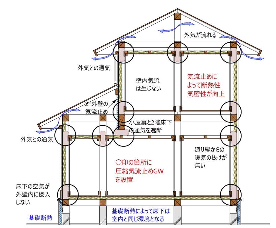 気流止めとは、壁の中や床下などに空気が通り抜けないようにする施工方法(下図の〇部の空気の流れを止める施工)です。