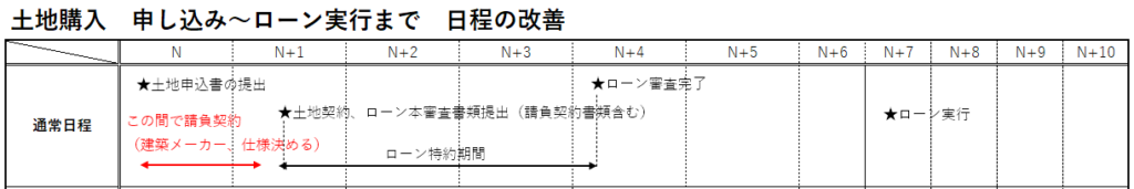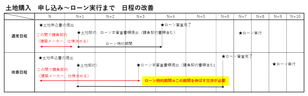 □ ①〜②の間に建物請負契約を結ぶ必要があるかを確認し、間に合わない場合はローン特約を1-2か月と延長を依頼する。